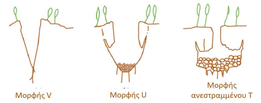 Τα αυλάκια που σχηματίζουν οι μηχανές σποράς μπορεί να έχουν τρεις βασικές μορφές, τη Μορφή V, τη Μορφή U και τη Μορφή ανεστραμμένου Τ.