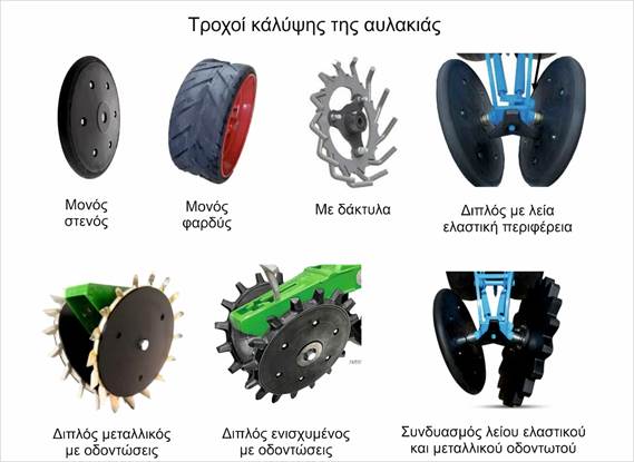 Οι τροχοί κάλυψης μπορεί να είναι μονοί ή διπλοί, στενοί ή φαρδύτεροι, λείοι ή με οδοντώσεις ή δάκτυλα. Οι διπλοί είναι πιο αποτελεσματικοί από τους μονούς γιατί πιέζουν από τα πλάι και τα δύο τοιχώματα της αυλακιάς, καταλαμβάνουν όμως μεγάλο πλάτος γεγονός που δυσκολεύει την τοποθέτησή τους σε μηχανές πυκνών γραμμών όπως οι σπαρτικές σιτηρών. Οι λείοι με ελαστική επίστρωση εργάζονται ικανοποιητικά σε ελαφρού τύπου εδάφη όπου τα τοιχώματα της αυλακιάς σπάνε εύκολα. Για πιο συνεκτικά εδάφη, χρησιμοποιούνται τροχοί με δόντια, γαμψά δάκτυλα ή άλλους σχηματισμούς που πιέζουν και σπάνε το έδαφος για να σκεπάσει το σπόρο. Οι λείοι τροχοί χρειάζονται μεγάλη πίεση που μπορεί να προκαλεί υψηλή συμπίεση στο έδαφος ενώ οι οδοντωτοί ή με δάκτυλα δουλεύουν αποτελεσματικά και με λιγότερη πίεση, αλλά μπορεί να σκάβουν το αυλάκι και να βγάζουν έξω το σπόρο. Σε βαριά και υγρά εδάφη, οι λείοι τροχοί μπορεί με τη σπορά να κλείνουν το αυλάκι αλλά αυτό να ξανανοίγει αργότερα εξαιτίας της συρρίκνωσης που προκαλεί το στέγνωμα. Αντίθετα, οι οδοντωτοί δίσκοι και οι δίσκοι με δάκτυλα προκαλούν θρυμματισμό των τοιχωμάτων της αυλακιάς αποτρέποντας την αποκόλληση των δύο τοιχωμάτων και την αποκάλυψη του σπόρου, μπορεί όμως να οδηγούν και σε απώλεια πολύτιμης εδαφικής υγρασίας. Οι τροχοί με γαμψά δάκτυλα ή ο συνδυασμός λείων και οδοντωτών τροχών είναι μια καλή λύση για βαριά εδάφη όταν θέλουμε να αποφύγουμε την υπερβολική συμπίεση, την διάρρηξη της αυλακιάς με το στέγνωμα αλλά και τον υπερβολικό θρυμματισμό των τοιχωμάτων που οδηγεί σε απώλεια υγρασίας.
